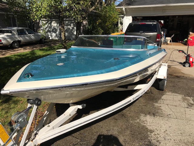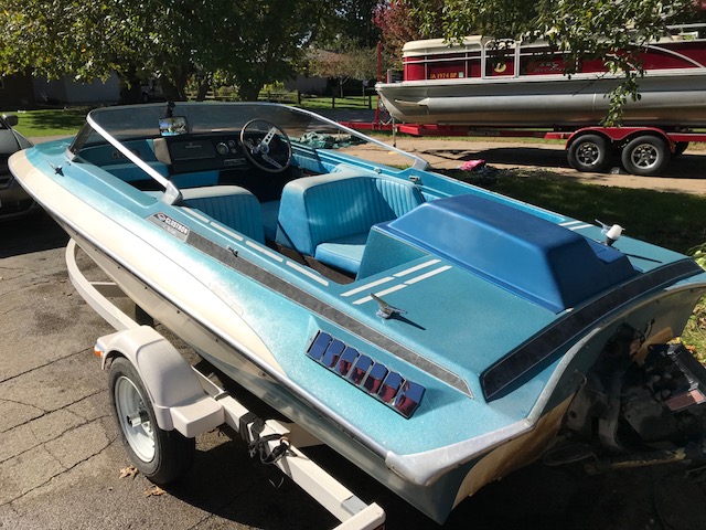 This boat has been on Fountain Lake in Albert Lea last 5 years with minimal use. Carb rebuilt approx 5 years ago when purchased. Runs well and everything works (blower, bilge and trim). 140 Mercruiser with plenty of juice left. I have many more pics if you would like. I will have the boat in Red Wing on 8/18 at CGOAMN by 9:00 a.m. You're welcome to inspect and drive if interested. Interior is clean but shows it's age. Engine hood has been repainted. Floor has soft spots around hood hinge locations and hinges are not attached to floor. Hull and transom are sound. This is a solid, fully functional, mechanically sound boat that can be used as is OR a great project boat with good bones for restoration. Father-in-law passed away last year and mother-in-law just wants it sold. Untitled boat but we have appropriate transfer paperwork from the state of MN. Looking for $1800. Jay at 507-393-8697.