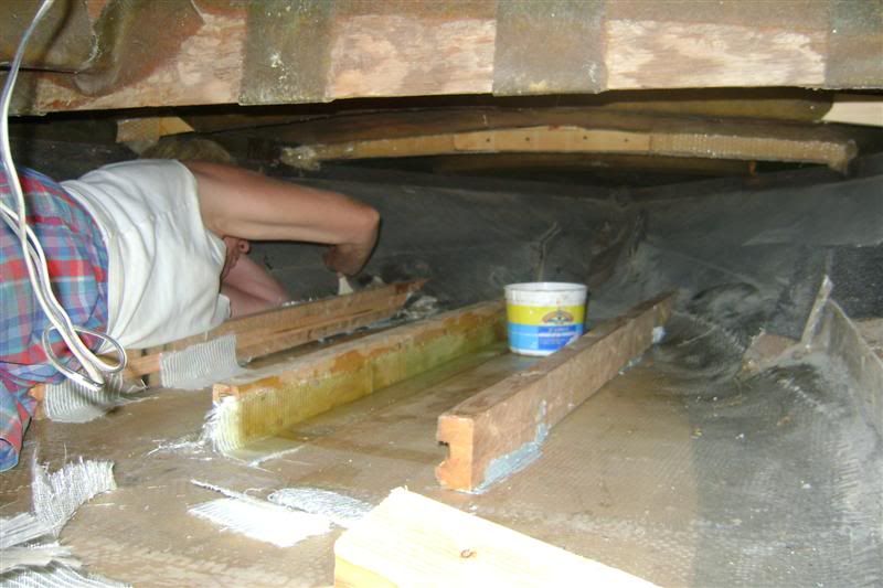 The question is Can a 32 yr old man crawl up inside the bow of a CVX 18 answer? Yes. But i would not recommend it. I had to get the bow eye out so there are no tape lines around it. Got to looking at it and the wood was pretty bad so out with the old and in with the new. Hoping to paint sometime next week fingers crossed.