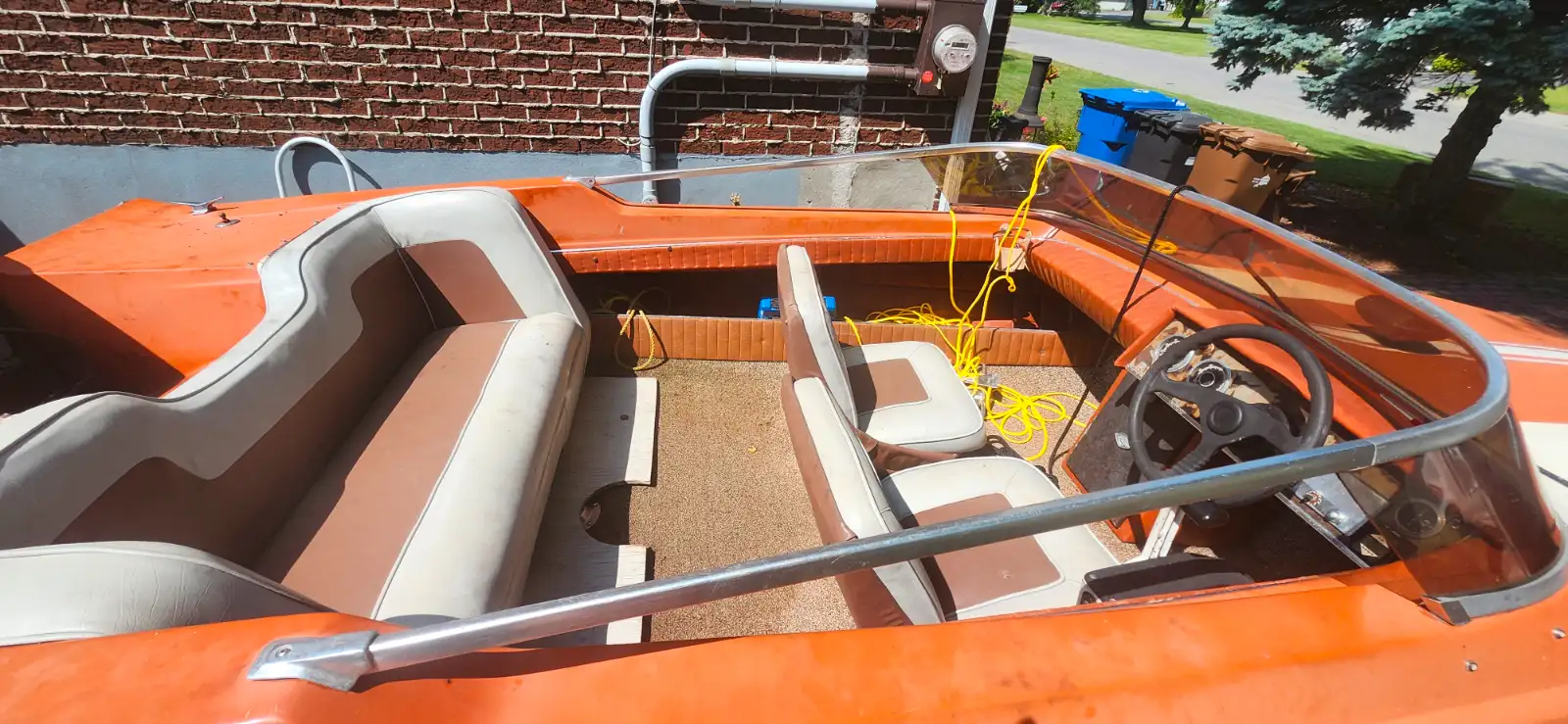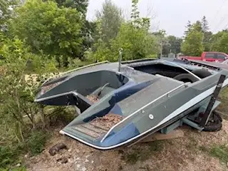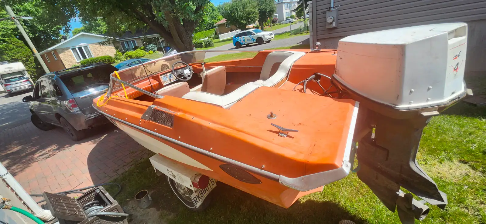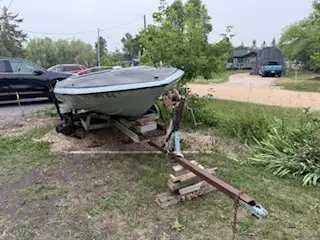 Its a glastron GT150 very hard boat to find it has some sunfade and few cracks on the top half had it in water last year went to do interior and just never got around to it have a 115 horse evenroude runs mint as the vidio shows 4 cylinder 2 stroke comes with brand nee earmuffs make me and offer the trailer needs tires and chains no ownership for either