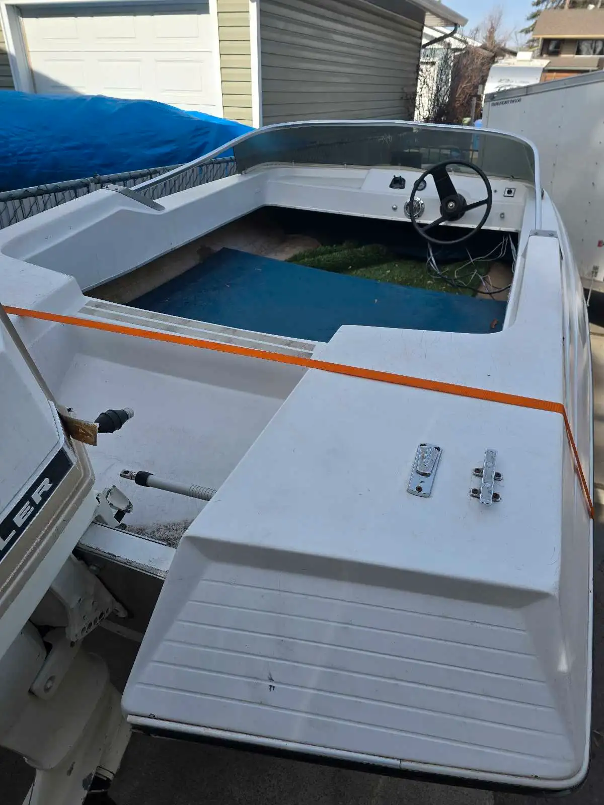 Has original Ride Guide cable steering, works smoothly and effortlessly. Original stainless steel and blue metallic vinyl wrapped steering wheel. Navigation lights and new automatic bilge pump all work as they should. New battery and bracket. Newly restored OMC 6-gallon fuel tank and water separating filter, with new fuel line and primer bulb. Propeller is a reconditioned 4-blade 13-1/2? x 21? OMC Renegade stainless.